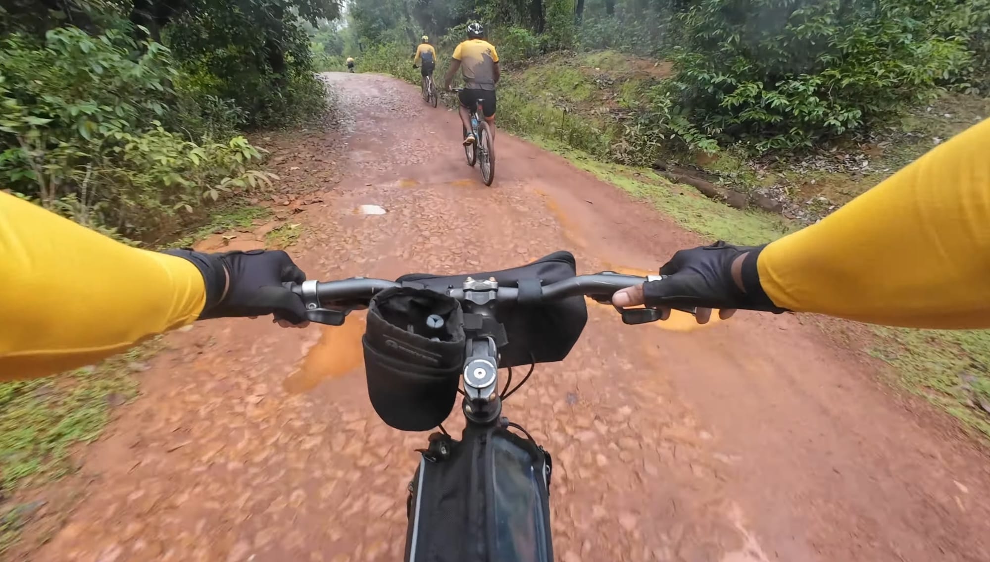 I typically don’t use the chest mount unless I'm going downhill. For normal shots, I prefer to do them handheld. I attach my action camera to the selfie stick. For quick access, I use that water bottle bag. Whenever I'm done with shooting, I just place my camera inside the bag. As an introvert, I don't want to draw too much attention while riding, and this setup really helps with that. As a bonus, you can even use the selfie stick to scare off any aggressive dogs!